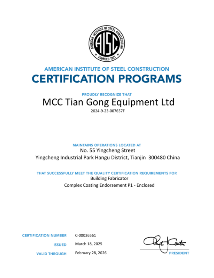 AISC認證是美國鋼結構協會針對鋼結構制造工廠的質量管理體系認證,旨在確保企業具備符合北美市場要求的技術能力和管理規范。審核組先后審查了材料庫及廠區的各工位,并對材料管理、材料追溯、焊接工藝油漆工藝等生產過程控制進行了現場審核,其中對現場構件的追溯、油漆工理論及操作、焊工理論及操作、焊接預熱記錄、焊縫外觀及尺寸等進行了隨機的抽樣檢查,抽樣結果完全符合AISC程序文件和工藝要求。隨后,審核員對公司的質量手冊、程序文件以及過程控制文件資料進行了認真審核。