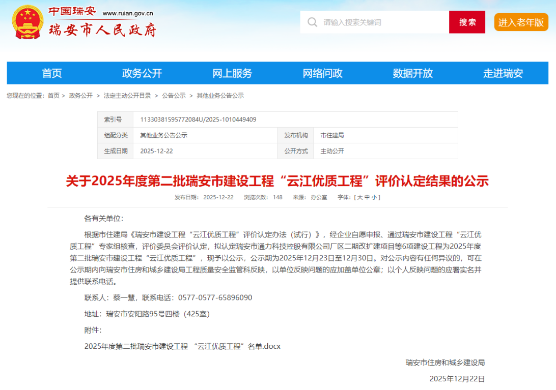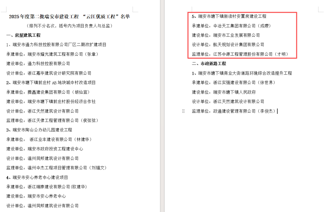 近日,南方公司瑞安塘下鎮(zhèn)104國道安置房建設(shè)項(xiàng)目新瀆村安置房建設(shè)工程榮獲2025年度第二批瑞安市建設(shè)工程“云江優(yōu)質(zhì)工程”。