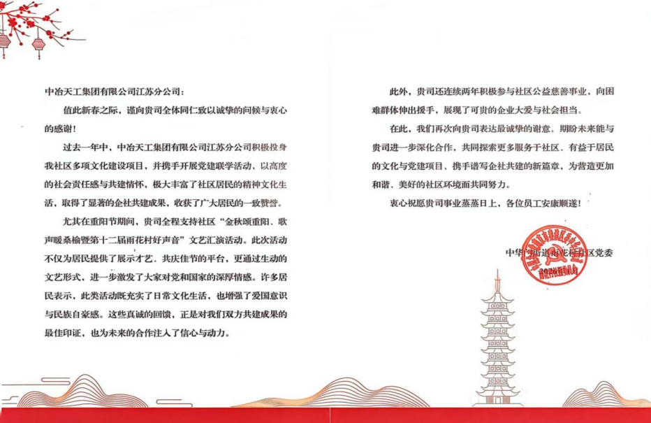 中原公司收到南京市秦淮区中华门街道雨花村社区感谢信