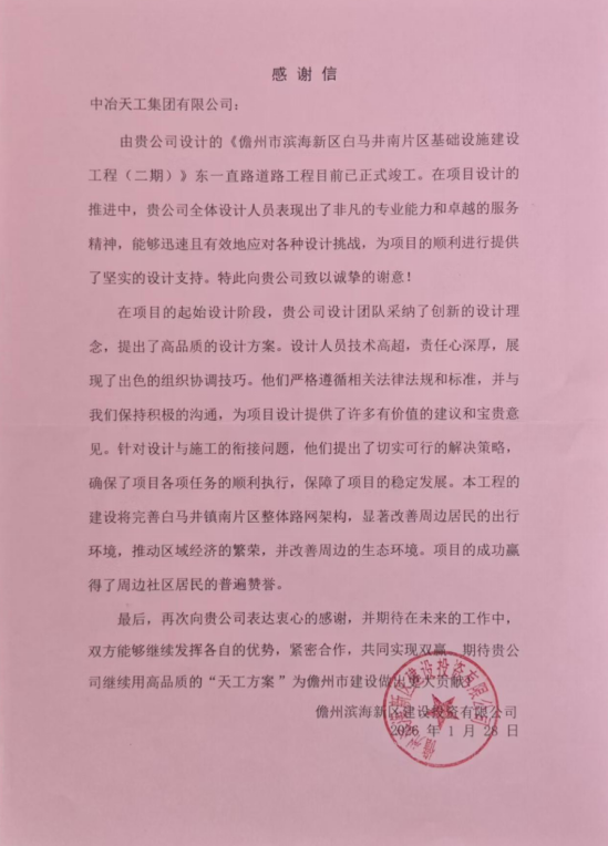 近日,工程技術(shù)總院海南省儋州市濱海新區(qū)白馬井南片區(qū)基礎(chǔ)設(shè)施建設(shè)工程(二期)設(shè)計項目收到業(yè)主儋州濱海新區(qū)建設(shè)投資有限公司向中冶天工發(fā)來的感謝信。信中,業(yè)主單位對設(shè)計團隊的高品質(zhì)服務(wù)給予高度評價。