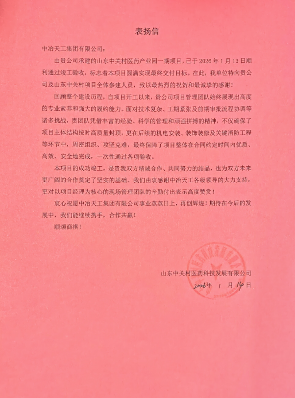 信中指出,項目管理團隊憑借豐富的經驗、科學的管理和頑強拼搏的精神,不僅確保了項目主體結構按時高質量封頂,更在后續的機電安裝、裝飾裝修及關鍵消防工程等環節中,周密組織、攻堅克難,最終保障了項目整體在合同約定時間內優質、高效、安全地完成,一次性通過各項驗收。